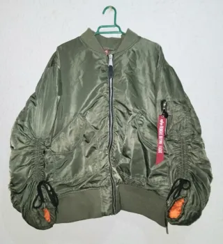 Chaqueta bomber de Alpha Industries en color verde militar. Diseño oversize, de aviador. Cremallera frontal. Bolsillos laterales. Detalle de bolsillo en manga con cinta Remove Before Flight. Tallaje ajustable de la S a la M, por medio de los cordones laterales y el cordon de la espalda, muy práctico, nuevo sin etiquetas, ningún uso .Intacta