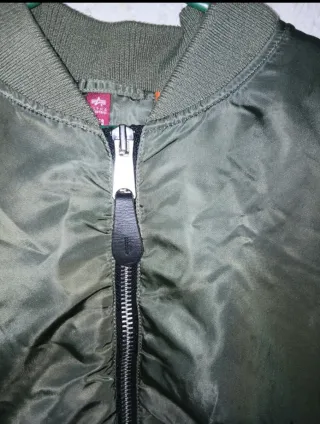 Chaqueta bomber Alpha Industries, en color verde oliva. Está en buen estado pero tiene una pequeña mancha que no he podido quitar que se ve en la última foto, de ahí el precio. La cremallera y todos los cierres funcionan perfectamente. Los puños no tienen enganchones ni agujeros. - Talla: X-small - Bolsillos funcionales - Cierre de cremallera