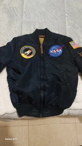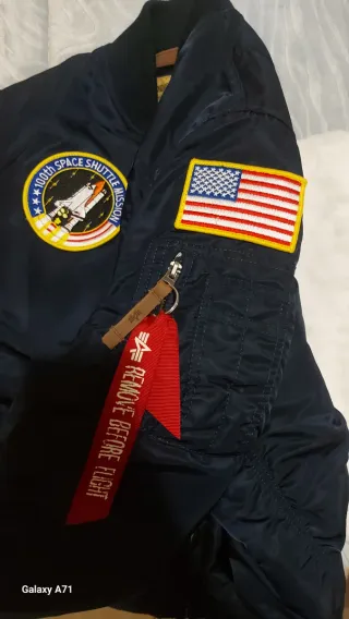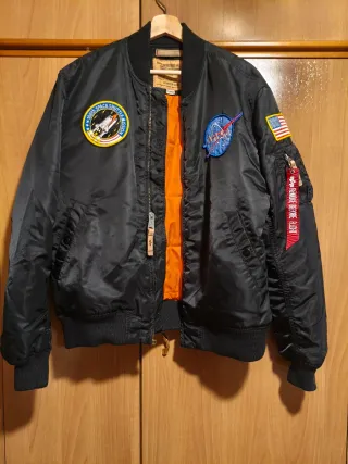 Chaqueta estilo bomber Alpha Industries con forro naranja y parches de la NASA y la misión Space Shuttle. Es una talla XL no muy grande, valdria como L también. Color negro y en perfecto estado. Salvo que tiene un bolsillo cosido en el interior, no se ve, es por dentro. - Parche de la NASA. - Parche de la misión Space Shuttle. - Bandera de Estados Unidos. - Detalle Remove Before Flight en la manga.