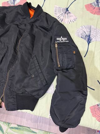 Chaqueta bomber reversible Alpha Industries MA-1 en talla XL, grande, en perfecto estado, es un color azul oscuro, navy, en las fotos parece negro. - Diseño clásico de aviador. - Interior en color naranja vibrante. - Cremallera frontal. - Bolsillo utilitario en la manga.