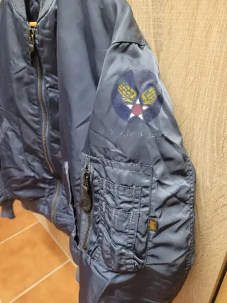 Chaqueta bomber Alpha Industries CWU-45 Imperial con el logo bordado en la espalda, en color azul oscuro navy, el azul de las Alpha de los 90s vintage. Parche extraíble. Es una talla XL, dejo medidas: 68 de axila a axila, 63 de manga, 54 de hombro a hombro. 61 de largo desde el hombro hasta abajo, y 66 desde el cuello hasta abajo. Solo tiene esas dos marcas de las últimas fotos, no son agujeros, no sé si es pintura o quemado, pero casi no se ve, y está en un sitio poco visible. Gomas y cremalleras muy bien. Precio negociable.