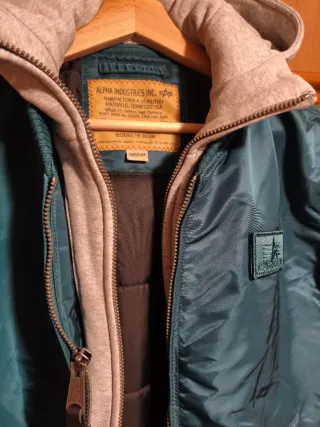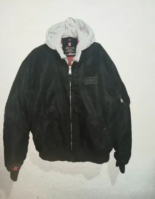 Chaqueta bomber Alpha Industries MA-1 Hooded, original y en perfecto estado. Es una 2XL normal, no excesivamente grande, podría valer para alguien de XL también. La capucha de este modelo no es extraíble. Muy buena calidad, perfecto para el frío y la lluvia. Gomas y cremalleras perfectas, a penas se ha usado. - Cierre frontal con cremallera. - Puños y cintura elásticos. - Bolsillo utilitario en la manga izquierda con distintivo rojo. - Cuello con acabado de pelo sintético.