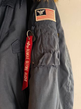 Chaqueta de la marca Alpha Industries en color azul. - Talla XL (46/56). - Diseño con capucha y pelo. - Parche de bandera americana en manga. - Detalle de cinta Remove Before Flight.