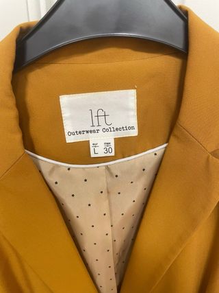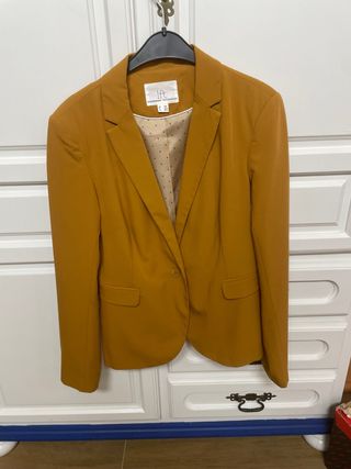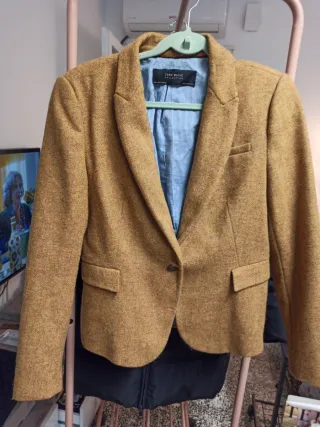 Americana de Zara con un diseño clásico y elegante. Perfecta para añadir un toque sofisticado a cualquier atuendo. Pone XL pero es muy pequeño es una talla M. - Color amarillo con textura. - Forro interior a cuadros azules.