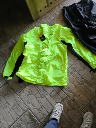 Conjunto de traje impermeable de dos piezas. - Chaqueta de color amarillo brillante con detalles en negro. - Pantalón de color negro. - Marca FUENTE.