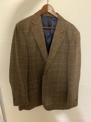 Chaqueta de vestir con un diseño de cuadros clásico y elegante. Ideal para ocasiones formales o para añadir un toque sofisticado a tu atuendo. - Patrón de cuadros en tonos marrones y detalles en amarillo y azul. - Forro interior de color azul marino. - Cierre de botones. - Bolsillos frontales.