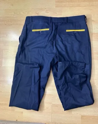 Conjunto de traje completo con detalles distintivos. - Talla chaqueta 48 - Pantalón 46, M/S - Azul marino - Chaqueta con solapas y cierre de botones - Varios bolsillos - Pantalón a juego. - Ribete y detalle de bolsillo en color amarillo.