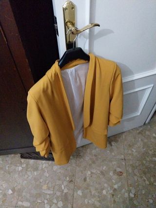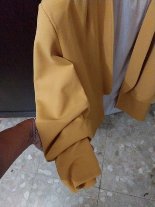 Chaqueta americana larga amarilla de Stradivarius (sirve como vestido) Chaqueta tipo blazer larga de Stradivarius en color amarillo pastel. Talla XS. Sirve también para S. Se puede llevar abierta como chaqueta o cerrada como vestido, queda ajustada y muy estilosa. Tiene doble botonadura en tono carey y solapas clásicas. La compré por 35,95 € y está en muy buen estado, apenas utilizada. Perfecta para looks arreglados, eventos, cenas, primavera/verano o entretiempo. Si necesitas medidas o más fotos, te las paso sin problema.