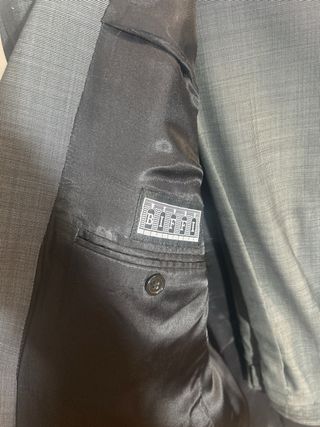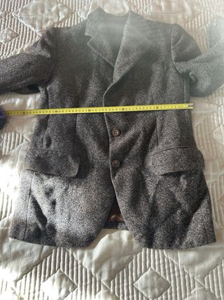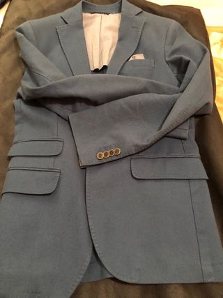Traje de chico comprado en El Corte Inglés. Original chaqueta larga con botones escondidos. Forrada. Talla 48 44 % lana Ancho de hombros: 47 cm Cintura: 50 cm Largo de la chaqueta: 85 cm Largo de la manga: 65 cm Cintura del pantalón de lado a lado: Largo del pantalón: 110 cm Perfecto estado.