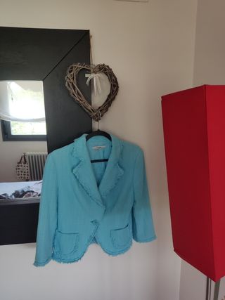 Elegante traje de chaqueta, color azul grisáceo, talla 46. Comprado en El Corte Inglés por 100€ y solo usado una vez. Mejor ver y probar.