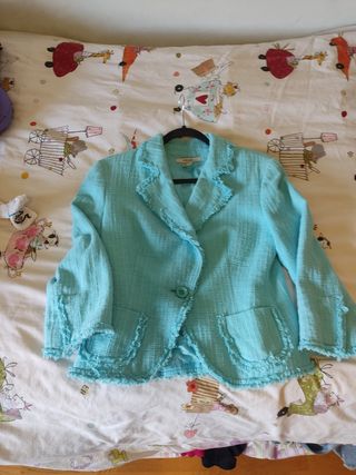 Chaqueta corta turquesa, talla 40 marca Zara. Se puede ver en las fotos los detalles de flecos en todos los ribetes de la chaqueta, además en los puños tb y están abiertos,queda muy coqueta.