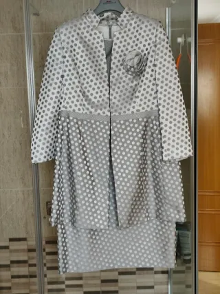 Elegante traje de ceremonia de la marca Luis Civit. - Diseño con lunares plateados sobre fondo blanco. - Incluye un detalle floral a juego. - Corte tipo chaqueta larga.