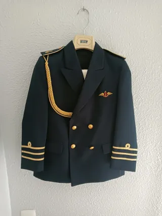 Traje de gala para niño, ideal para eventos especiales. - Chaqueta cruzada con detalles dorados. - Hombreras con cordón dorado. - Insignia bordada en la solapa. - Puños con galones dorados.