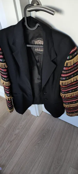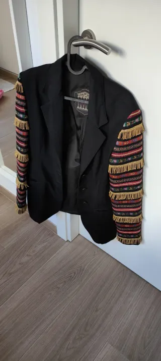 Americana elegante con un diseño llamativo en las mangas. - Mangas adornadas con tejido estampado y flecos dorados. - Cierre de botones al frente. - Bolsillos frontales.