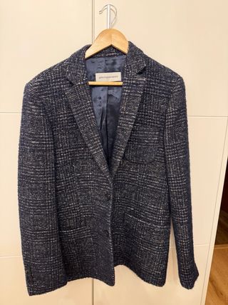 Americana de hombre nueva, talla 38, de la marca Mango (slim fit). Modelo de alta calidad, con un elegante estampado de cuadros en tonos azules. Está completamente nueva, con todas las etiquetas, botones de repuesto y sin estrenar. Cuenta con forro interior en color azul marino y tres bolsillos interiores, dos de ellos con cierre. Los bolsillos exteriores, así como las aperturas traseras, siguen con el cosido original de fábrica, indicando que nunca se ha usado. Corte slim fit, versátil y favorecedor, ideal tanto para look formal como para un estilo más casual. Se entrega con percha y funda de plástico