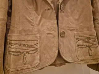 Americana de piel en tono camel con bordado en bolsillos. Opcional: Lleva botones para incorporar un cuello Talla 40 Buen estado #americanvintage #americana #americanamujer