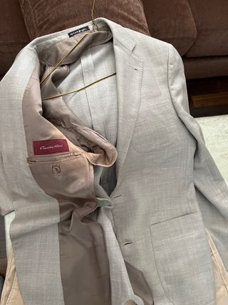 Traje de chaqueta y pantalón de Massimo Dutti. Chaqueta talla 46 equivalente a la talla S. Pantalón talla 40, para estatura de 1,78 aprox. - Chaqueta de corte clásico. - Pantalón a juego. - Tejido de calidad para temporada de primavera - verano, ya que es fresco.