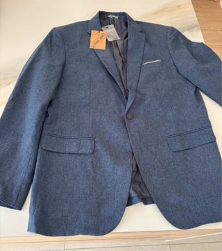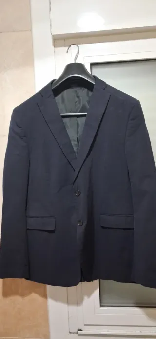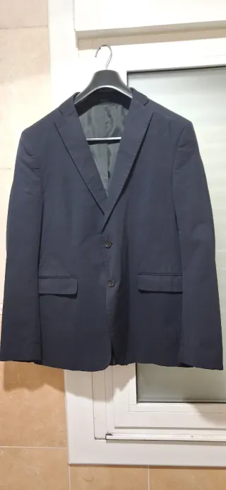 Americana de estilo lavado. Para uso más informal. Pantalon azul marino talla 50 - Cuello camisero. - Cierre de botones. - Bolsillos frontales. 35 € americana y pantalón azul marino. No es traje pero puede ir junto