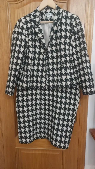 Conjunto de chaqueta y falda con estampado de pata de gallo. - Diseño clásico. - Ideal para ocasiones formales o informales.