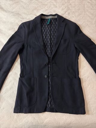 Americana de vestir o informal, para hombre en color azul marino, con coderas. - Talla S. Si usas una M, te quedará ajustada pero quizá te podría valer. - En perfecto estado. - Cierre de dos botones. - 2 Bolsillos frontales, y otro en el pecho. - Un bolsillo interior. - Botones en los puños de las mangas. - Tejido: 97% algodón, 3% elastan.