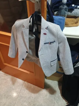 Conjunto de traje para niño, ideal para eventos especiales como comuniones. El diseño combina tonos beige y azul claro, ofreciendo un estilo elegante. - Chaqueta con detalles en los puños. - Chaleco a juegocon espalda de raso - Pantalón de lino con goma y largo para poder sacar Ver medidas.Pregunte lo q necesite.NO HAGO CAMBIOS Zapatos vendo a parte n.39 28€