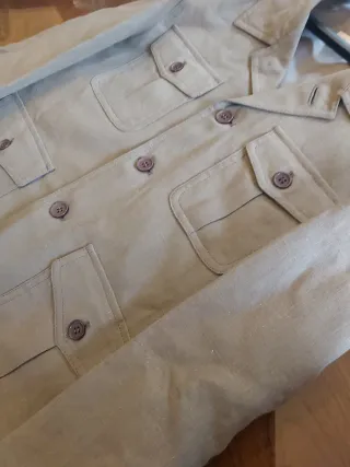 Chaqueta de manga larga totalmente forrada, ideal para comunion o eventos especiales. Buena confección y buenos acabados. 56% Lino, 54% algodon. Talla 12, medidas: hombro 38cm, axila 47cm, largo desde la mitad del hombro 59cm. Comprobar medidas. El color es el de la última foto, es un marrón tirando a verde oliva. - Cierre de botones. - Bolsillos frontales con solapa y botón por si se prefiere cerrar el cuello.