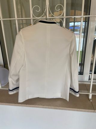 Chaqueta de vestir para niño, ideal para comuniones o eventos especiales. - Diseño elegante en color blanco. - Detalles dorados en botones y escudo. - Adorno de cordón trenzado en el hombro. - Puños con detalles en azul marino. Talla 12, aunque es mas pequeña