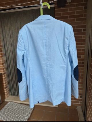 Americana de niño con un diseño moderno y elegante. Perfecta para ocasiones especiales o para el día a día. - Cierre de un botón. - Bolsillos frontales. - Puños con tres botones. Americana comunion niño. Color azul claro, en perfectas condiciones. Sin manchas, como nuevo. Color perfecto.