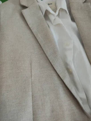 Conjunto de chaqueta y pantalón veige y celeste, elegante para niño tejido : lino - ideal para EVENTOS Características: - Chaqueta azul claro con botones de madera y coderas beige.(ancho hombros 35cm, largo brazo 56cm largo chaqueta 59cm. - Pantalón beige de corte recto de lino(con boton y gomillas regulable en anchura talla (11-12 años) * REGALO: camisa blanca de ZARA material lino (con cuello mao) talla 11-12 manga larga, regulable (botón lateral)