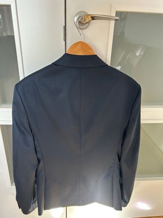 Americana traje en tejido estructura Slim fit. Cuello de solapa y cierre delantero con 2 botones. Bolsillos de ribete en pecho y parte delantera. Manga larga con puños abotonados. Forro interior con bolsillo abotonado interno. Bajo recto con abertura central. Talla S/38 Nueva, con un solo uso.