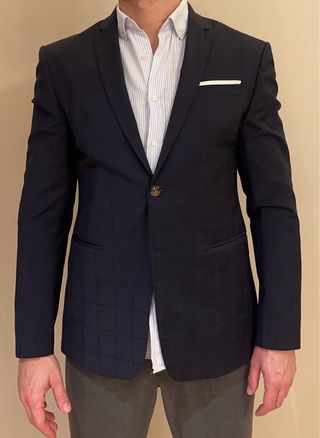 Se vende Americana de vestir de Zara con un diseño de cuadros sutil en azul marino. En muy buen estado, solo hay que coser un botón que se soltó pero que adjunto en el bolsillo interior. - Color azul marino con detalles en cuadros. - Cuello solapa. - Cierre de un botón.