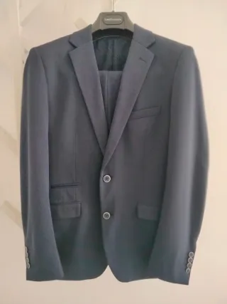 Elegante traje de dos piezas. Es juvenil, mi hijo solo lo ha utilizado en nochevieja. Lleva elastano. - Chaqueta con solapa de muesca. - Cierre de dos botones en la chaqueta. - Bolsillos frontales con solapa. - Puños con botones.