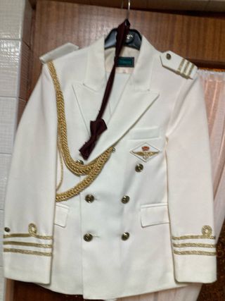Traje de comunión elegante en color blanco con detalles dorados. - Chaqueta con doble abotonadura. - Galones dorados en puños y hombros. - Cordón dorado decorativo. - Escudo bordado en el pecho. TALLA 10