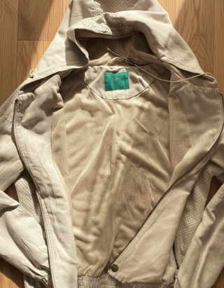 Chaqueta tipo biker con capucha, en serraje antelina. Color beige, forrada y con cremalleras. Talla 40 de mujer, en muy buen estado. Precio original: 69,99 €. Medidas: 56 cm axila a axila · 62 cm largo. #Y2K #Streetwear #Suede #Antelina #Chaqueta #Biker #Mujer