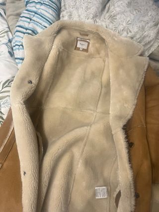 Chaqueta para mujer de la marca Pepe Jeans London, estilo aviador / shearling. - Tono camel / marrón claro, con acabado tipo ante o piel vuelta. - Interior completamente forrado de borreguito beige y muy suave. - Diseño de doble botonadura. - Cuello de solapa con acabado de pelo. - En la ultima foto se muestra en el interior de la chaqueta una pequeña mancha pero no es muy visible.