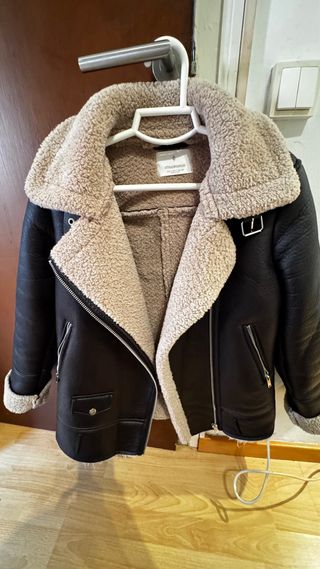 Chaqueta abrigada de Stradivarius con forro de borreguito. - Diseño tipo aviador. - Cierre de cremallera. - Bolsillos con cremallera y solapa. - Cinturón ajustable en el bajo. - Usada muy poquito (vendo por cambio de talla)