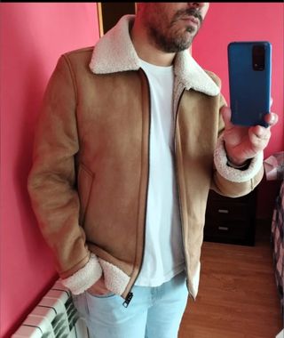 Cazadora de borrego estilo aviador de Bershka. Talla L. Es de color marrón y beige. - Cremallera frontal. - Cuello alto. - Bolsillos funcionales. Muy calentita. Ideal para invierno. Nunca usada.