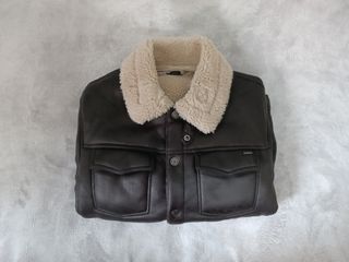 Chaqueta estilo motero de Zara, confeccionada en piel sintética con forro interior de borrego. Medidas Hombros y brazos 55 cm Largo 66 cm - Diseño de aviador. - Cierre de cremallera. - Puños y cuello con detalle de borrego. - Cinturón ajustable en la parte inferior.