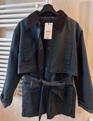 Chaqueta estilo trench de Barbour en color negro. Presenta un diseño moderno y versátil. - Cuello de pana. - Cinturón ajustable a juego. - Bolsillos frontales.