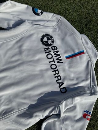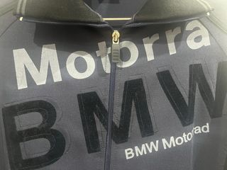 Chaqueta de moto BMW Traveler, en excelente estado. Muy cómoda y resistente, ideal para viajes o uso diario. Cuenta con forro térmico desmontable, protecciones en hombros, codos y espalda. Resistente al viento y al agua, con ajustes en cintura y mangas y varios bolsillos funcionales. Con el añadido de un parche personalizado en la parte trasera con diseño tipo Spitfire, que le da un toque más urbano y único. Fabricada con materiales resistentes y impermeables. Confeccionada en Cordura 100 % poliamida, material resistente y duradero.
