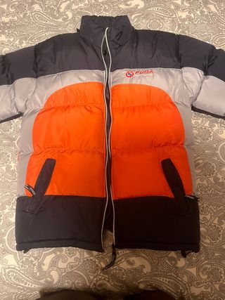 Chaqueta acolchada con diseño de bloques de color. - Paneles en color naranja vibrante. - Detalles en negro y gris. - Cuello alto para mayor protección. - Cremallera frontal.