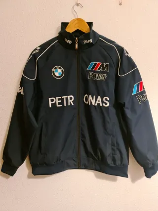 Chaqueta bomber con diseño inspirado en el equipo BMW M Power Petronas. Talla XL. Si pesas entre 70-80kg es tu talla. Medidas con cinta metrica en las demás fotos - Logo de BMW y M Power en el pecho y mangas. - Inscripción PETRONAS en grande en el frontal. - Detalles de DELL y Credit Suisse en las mangas. - Cuello alto con cierre de cremallera.