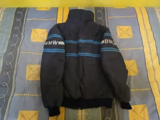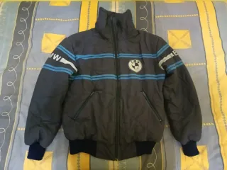 Se vende Cazadora tipo bomber, con detalles de la marca BMW, vintage, usada pero en buen estado, la talla en número es una 42 (M para hombre y L para mujer) - Diseño con franjas azules y blancas. - Logo de BMW en el pecho. - Cremallera frontal. - Bolsillos laterales con cremallera.