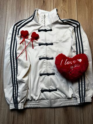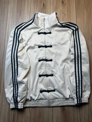 Chaqueta deportiva Adidas con diseño especial. - Color beige con detalles en negro. - Cierre de botones tipo oriental. - Mangas con las icónicas tres franjas.