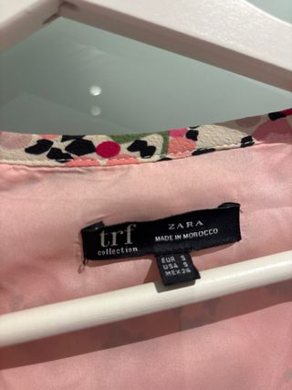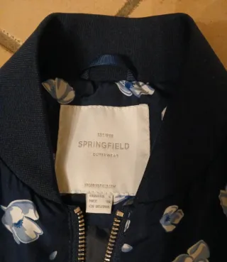 Camisa o chaqueta tipo bomber de flores, cierre de cremallera, bolsillos con cremallera, elastico negro en cuello, cintura y puños. No tiene enganchones. Marca Zara. Talla S. Puesta dos veces.