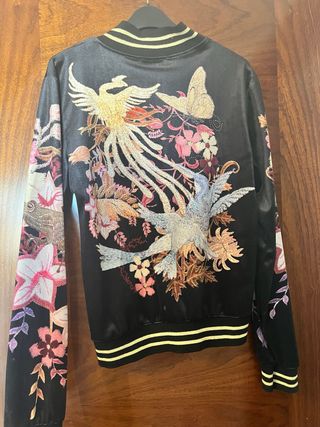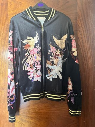 Chaqueta bomber satinada con un diseño bordado de grullas y flores. - Mangas y detalles en color dorado. - Cuello y puños elásticos. - Cierre de cremallera frontal. Es reversible. Comprada por Vinted pero no usada por mi. En muy buenas condiciones