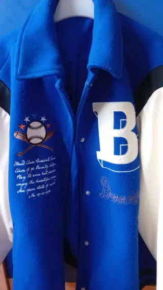 Chaqueta estilo americana universitaria con mangas blancas tipo cuero y cuerpo azul. - Diseño con bordado de béisbol y letras. - Cuello clásico. - Cierre de botones a presión.