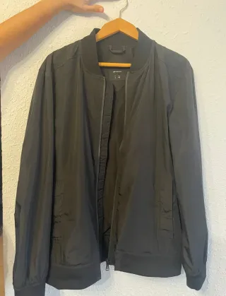 Chaqueta bomber muy ligera, ideal para entretiempo. - Diseño moderno y versátil. - Cierre de cremallera frontal. - Puños y bajo elásticos. -viene marcada como talla L pero yo diría que es más bien una M a no ser que te guste llevar la ropa muy justa. -Es de un tejido muy ligero, parece impermeable, y tiene un bolsillo interior aparte de los dos exteriores.