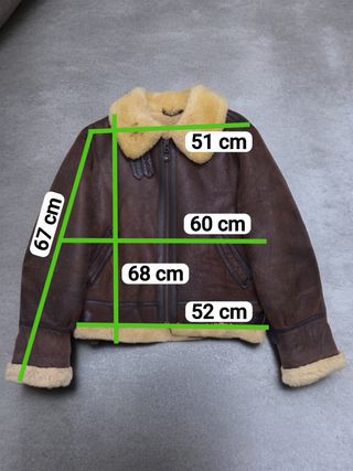 Chaqueta de aviador de cuero y de pelo de oveja de la marca Chevignon. En general está en buenas condiciones solo con algunas señales de uso y marcas. 🧴El cuero se mantiene suave y sin olores. 📝 Estado: 6/10 📏Medidas en las fotos. 🧍♂️ Recomendado para: 1,75 – 1,85 m / 78 – 90 kg. Complexión media o atlética. 👕Material 👕 Exterior: 100% cordero sin esquilar (shearling) Interior: 100% piel de cordero con lana (lambfell) ❌ Defectos ❌ Algunas marcas y rozaduras, manchas en el forro interior, un agujero cerca de la correa. avirex b3, chaqueta aviador, bomber shearling, piel, Sheepskin, oveja, Schott, Avirex, pelo, infierno, Scott