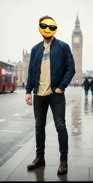 Chaqueta bomber estilo universitario con el logo Digital Reality. - Diseño con mangas blancas y cuerpo azul marino. - Puños y cuello con detalles de rayas rojas y blancas. - Cierre de botones a presión. - Parche con el número 8 en la manga. - Inscripción 1975 / 2025 en la parte delantera.